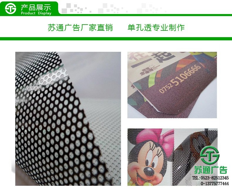 單孔透是用于戶外玻璃幕墻和車窗玻璃的一種理想的廣告材料,可以利用其噴繪出任何廣告或裝飾畫面;PVC膜經過制孔后的透光結構使得大約50%的光線透過畫面照射進來,在減少太陽光照射的同時,仍保證了高質量的廣告畫面,畫面的視覺效果不受到任何影響,而且不影響室內采光和視覺,達到外面只能看到廣告畫面,而室內往外看則仍是透明的效果。